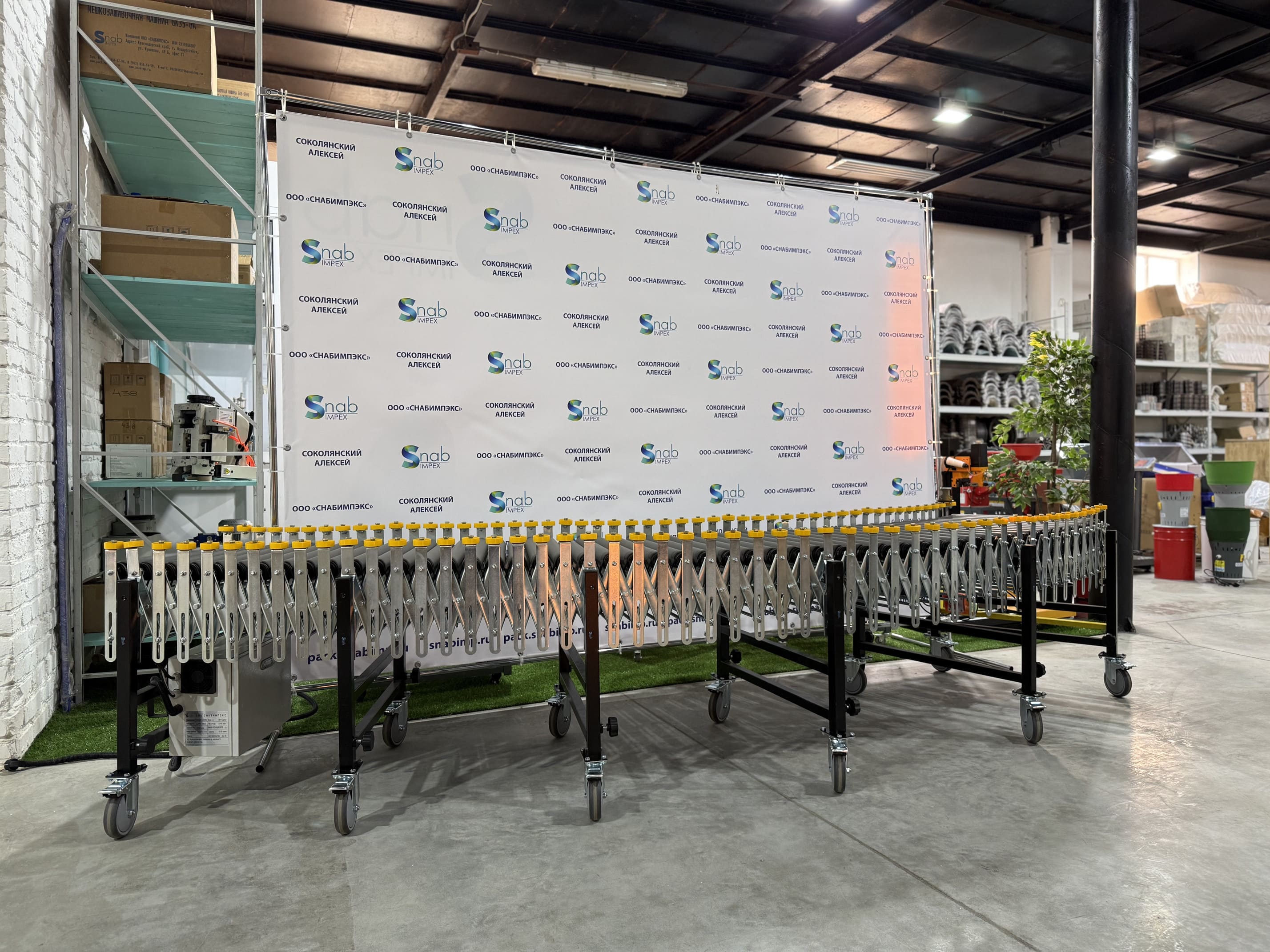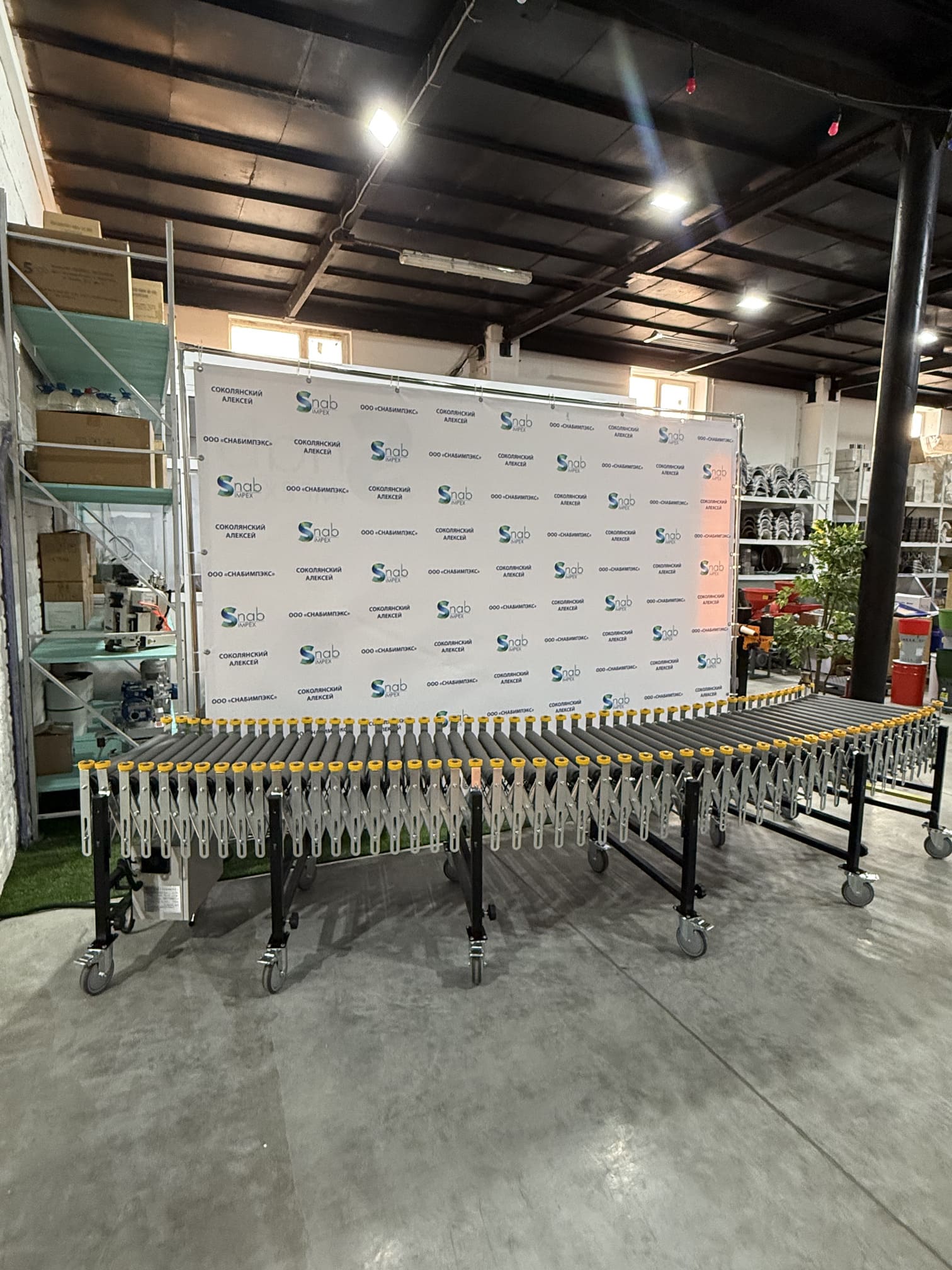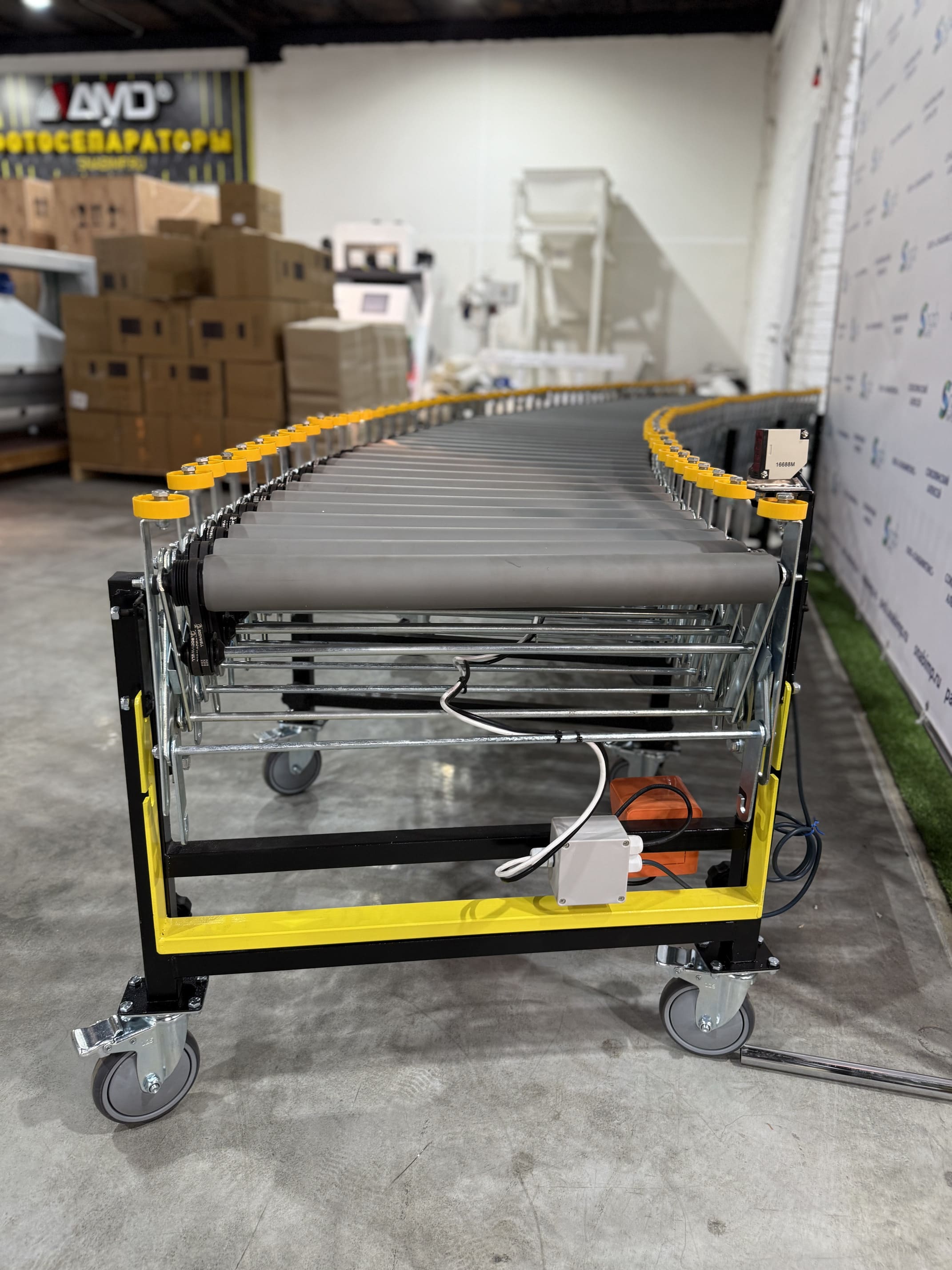 Регулируемая длина: Конвейер имеет раздвижную конструкцию, позволяющую изменять его длину от 4 до 28 метров, адаптируясь к различным задачам и конфигурациям помещений.